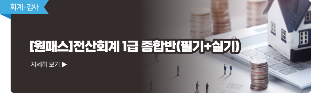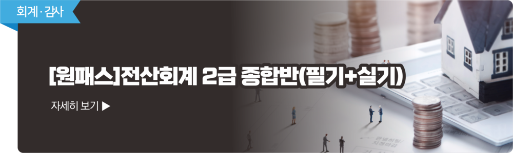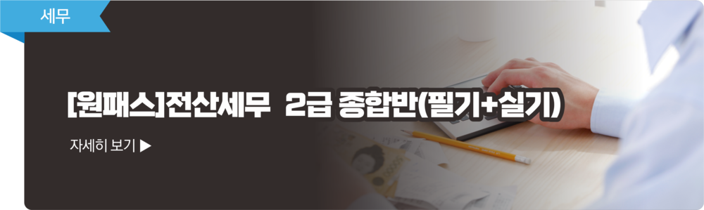 해당 과정은 한국세무사회 주관 자격시험 대비 과정으로 개정 세법 및 일반기업회계기준 완벽 반영. 상세한 이론 설명과 다양한 실무 화면을 통해 합격률 향상을 도모합니다. 전산세무 합격에 필요한 지식을 습득할 수 있습니다. 전산세무 관련 용어들을 파악하고 이해할 수 있습니다. 전산세무 자격 취득을 위한 필기와 실기 이론을 이해할 수 있습니다. 전산세무 2급 자격증 취득을 원하는 학습자에게 추천하는 과정 입니다.