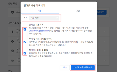 3. 기간은 "전체 기간" > 아래 이미지와 같이 모두 체크 후 인터넷 사용 기록 삭제 클릭