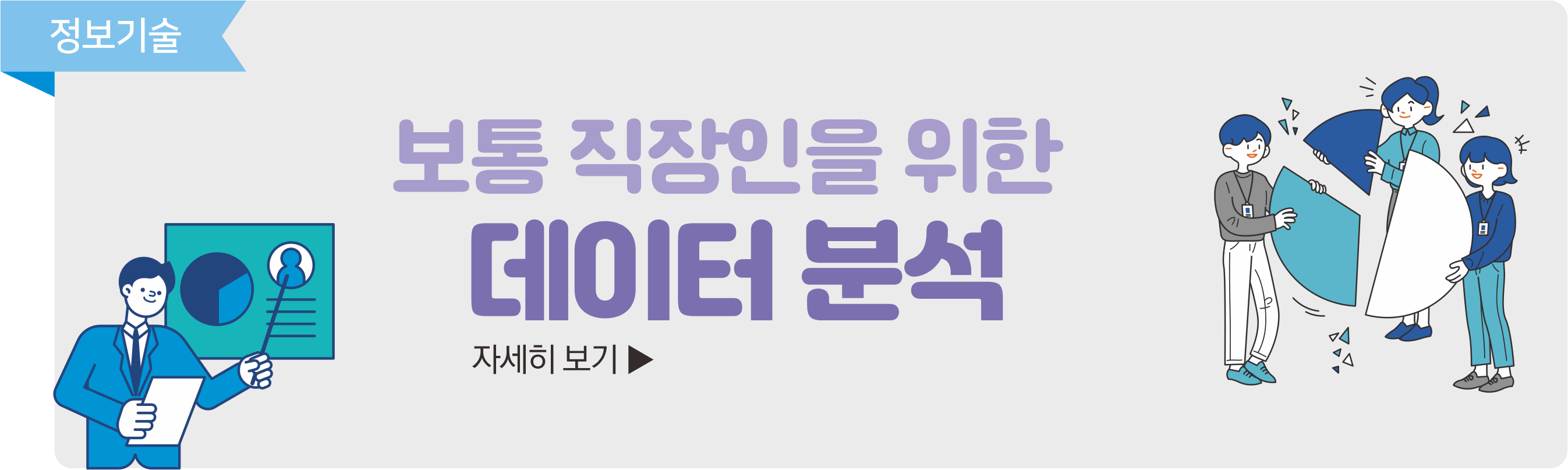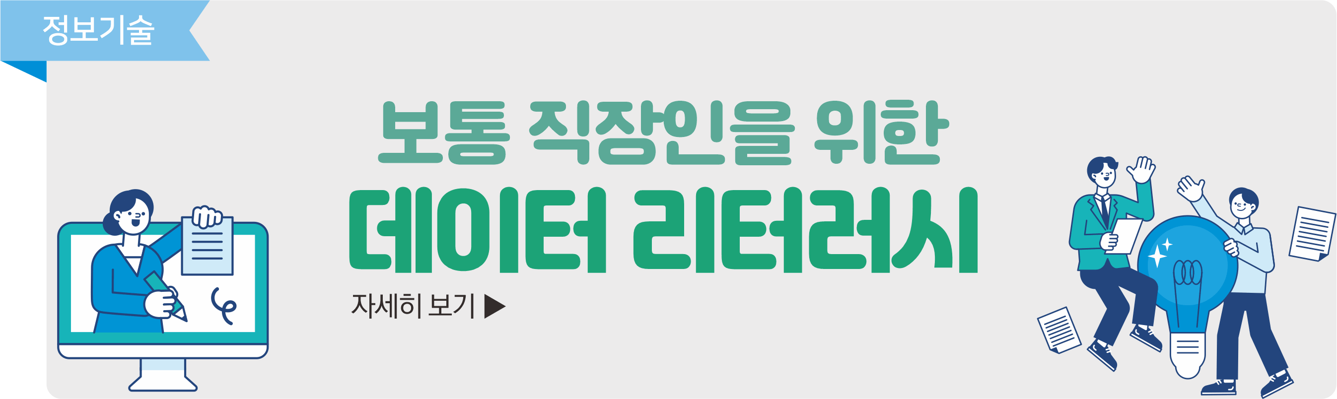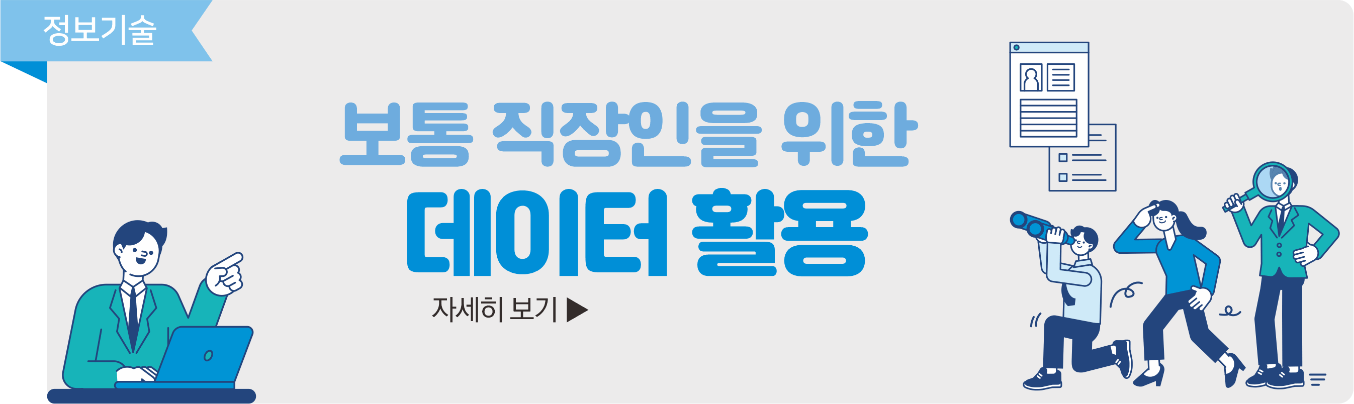 그것은 바로 데이터 역량 입니다. 본 과정은 누구나 쉽게 사용할 수 있는 엑셀/피피티/검색 프로그램 등을 기반으로 유용한 데이터 분석을 할 수 있도록 설계되어 있습니다.