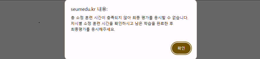 그 에 따라 각 차시별로 학습은 인정되었지만, 전체 소정훈련시간 대비 진행한 학습시간이 부족하면 최종 진도율 산정이 되지 않아서 평가진행이 불가 합니다.