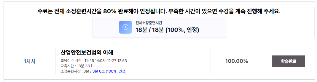 하지만 변경된 정책에 따라 2026년도 부터는 최종 진도율에 대한 기준이 전체 학습시간/전체 소정훈련시간*100 으로 계산하여, 소수점 발생시에는 둘째자리에서 반올림하여 계산을 하게 되었습니다.