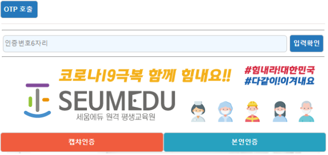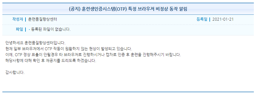 이에, OTP 정상 표출이 안될경우 엣지 브라우저로 진행하시거나 OTP창 하단의 캡차로 인증 후 훈련을 진행해주시기 바랍니다.