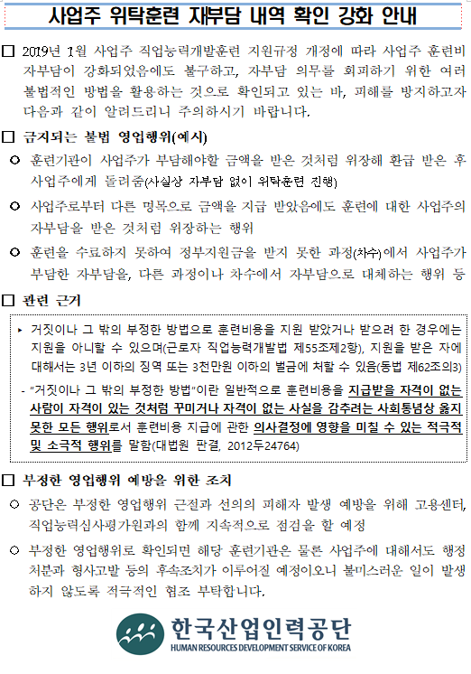 2019년 1월 사업주 직업능력개발훈련 지원규정 개정에 따라 사업주 훈련비 자부담이 강화되었음에도 불구하고 자부담없이 훈련이 가능하다는 식으로 영업을 하는 훈련기관이 있습니다. 훈련기관은 사업주가 부담해야할 금액을 받은 것처럼 위장해 환급 받은 후 사업주에게 돌려주는 방식은 불법입니다.