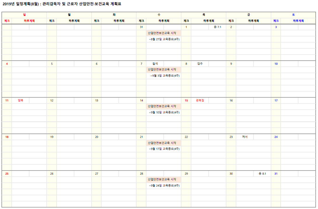 2019년 8월 진행가능한 관리감독자 및 근로자 산업안전·보건교육 계획을 아래와 같이 안내 합니다.
