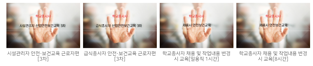 2021년도부터 Flash 지원종료에 따라 온라인 산업안전보건교육(Flash제작) 수강신청이 12월 첫째주에 마감되었습니다. 하지만 급식종사자 안전·보건교육 수요가 폭발적으로 증가함에 따라 수강신청을 연장하기로 결정하였습니다. 교육시작일자는 언제든지 가능하지만, 교육종료일은 2020년 12월 30일 입니다. 교육은 하루만에 진행이 가능 합니다. Flash를 대체할 HTML5과정은 현재 자체 개발중에 있으며, 내년 2월부터는 안정적으로 공급이 가능합니다. 현재 세움에듀에서 진행가능한 학교종사자 안전보건교육은 아래와 같습니다.