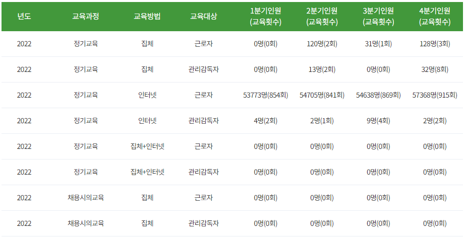 안전보건교육규정 제3조의2(근로자 안전보건교육기관의 교육편성방법 및 관리)와 관련하여, 2022년도 세움에듀에서 수행한 연간 교육실적을 작성하여 안전보건공단에 제출완료 하였습니다. 제출한 내용은 아래와 같습니다. 화면관계상 특별교육 및 채용시 교육의 인원은 보이지는 않지만 실제 분기별 평균 400명의 인원이 교육을 진행하였습니다.