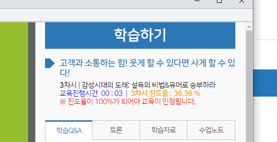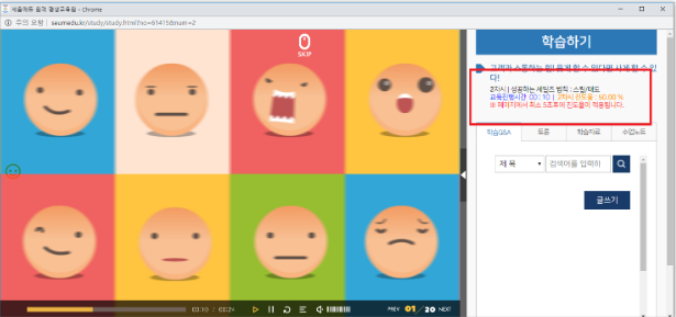 훈련생 및 기관의 편의성을 제공하기 위하여 아래와 같이 신규기능 2건이 업데이트되었습니다. 위 신규기능도입은 2019년 교육만족도조사 결과를 바탕으로 도입하였습니다. 1. 강의화면에서 진도율 실시간 출력 기존 훈련생들이 교육진행시 진도율이 강의창에서 확인되지 않다보니, 진도율이 100%가 되지 않은상태에서 교육을 종료하여 재교육을 받는 사례가 많았습니다. 그래서 아래와 같이 페이지 이동시마다 적용된 실시간 진도율을 강의창에서 확인할 수 있게 기능을 도입하였습니다. 강의창에서 진도율이 100%로 확인되면 교육을 종료하시면 됩니다.