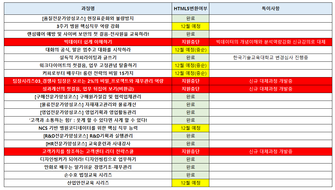 2021년부터 adobe 플래시 플레이어 중단으로 인해 일부 과정 운영 서비스가 중단될 예정입니다. <관련정보바로가기> 플래시로 제작된 콘텐츠 중 수강 빈도가 높은 과정들은 학습자가 계속 수강 가능하도록 개발 및 변환 작업을 진행중에 있습니다. 일부 과정은 이미 업데이트 되어 운영되고 있습니다. 서비스가 중단되는 과정들은 2020년 12월 02일까지만 수강신청이 가능하며, 복습은 2020년 12월 31일까지만 제공 됩니다. 플래시 플레이어 종료로 인해 아쉽게도 운영이 종료되는 과정들이 있지만, 2021년 새롭고 재미난 과정으로 다시 찾아뵙겠습니다. 그리고 세움에듀 자체개발한 법정교육(개발완료) 및 산업안전보건콘텐츠로(20%완료, 2021년 2월 개발완료예정) 2021년에 찾아뵐 예정입니다. 많은 관심을 부탁드립니다. 서비스 중단 과정 및 작업진행 과정은 아래 참고 부탁드립니다.