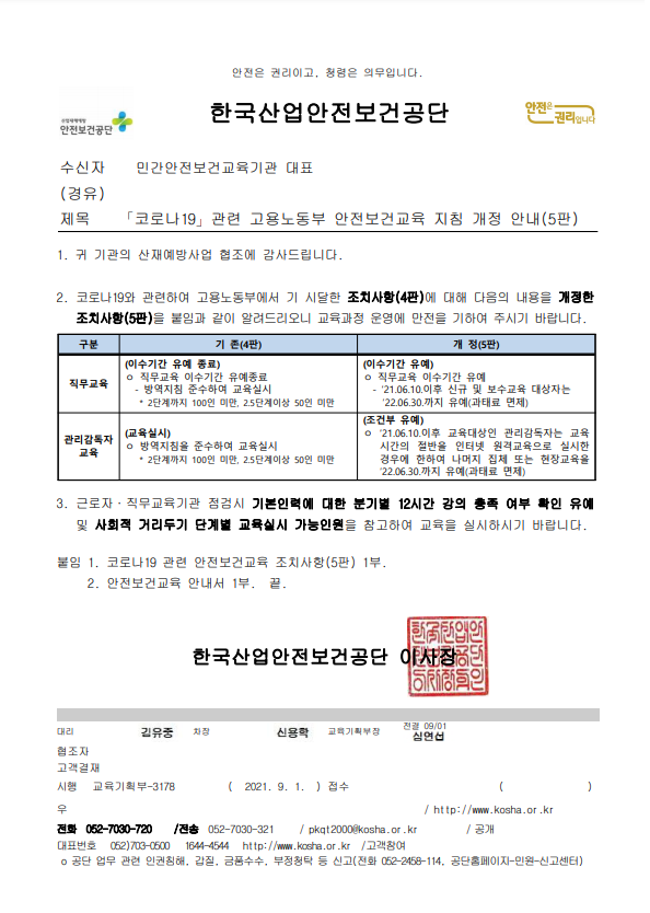 코로나19로 인한 산업안전 직무교육 및 관리감독자교육 관련하여 기 시달한 조치사항(4판)에 대해 아래와 같이 개정한 조치사항(5판)이 나왔습니다.
