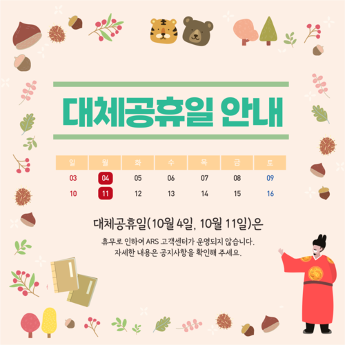 10월4일, 10월11일은 대체휴무로 인하여 ARS 고객센터가 운영되지 않습니다. 급한 용무가 있으신 분은 카카오톡 플러스 친구 "세움에듀"로 문의주시면 당직자가 상담가능한 시간에 안내해 드립니다. 단, 상담에 제한이 있는점은 양해바랍니다. 또는 홈페이지 학습지원센터 1:1상담에 문의글을 남겨주시면 24시간 이내에 답변을 드리겠습니다.