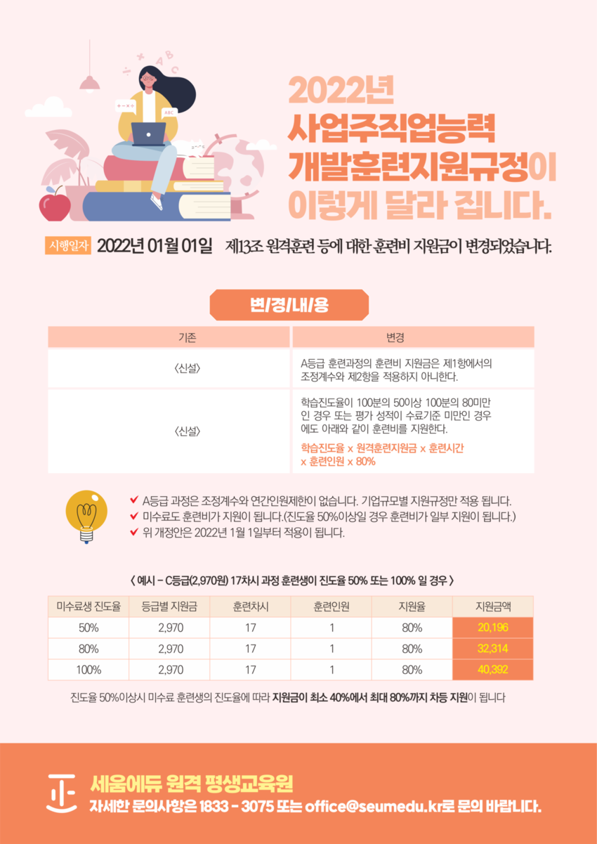 2022년 1월 1일부터 적용되는 사업주 직업능력개발훈련 지원규정(제2021-80호) 개정내용 관련하여 아래와 같이 안내 드립니다. 1) A등급 과정의 경우 조정계수 및 인원제한의 적용을 받지 않습니다. 2) 미수료 훈련생도 진도율이 50%이상일 경우 진도율에 따라 훈련비가 일부 지원이 됩니다.