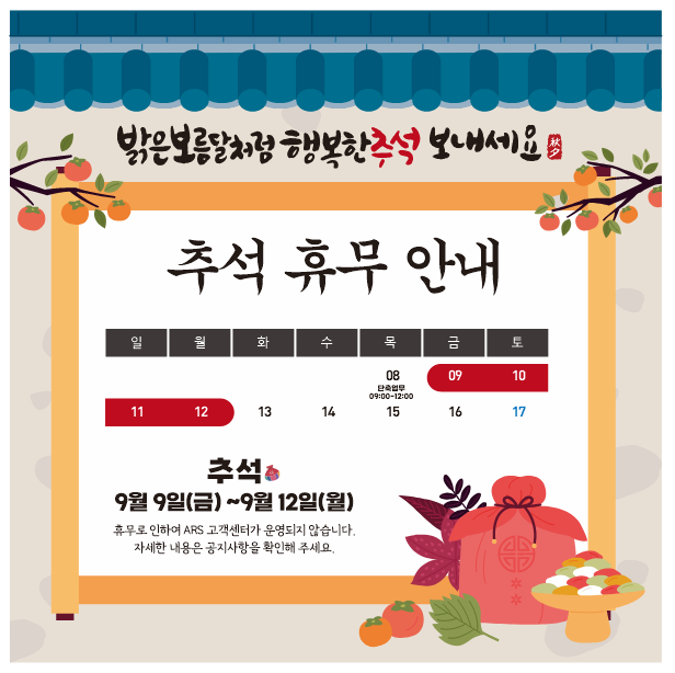 추석(9월9일~12일) 휴무로 인하여 ARS 고객센터가 운영되지 않습니다. ※ 9월8일은 오전 12:00시까지 단축근무를 합니다. 급한 용무가 있으신 분은 카카오톡 플러스 친구 "세움에듀"로 문의주시면 당직자가 상담가능한 시간에 안내해 드립니다. 단, 상담에 제한이 있는점은 양해바랍니다. 또는 홈페이지 학습지원센터 1:1상담에 문의글을 남겨주시면 24시간 이내에 답변을 드리겠습니다.