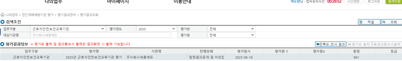 세움에듀가 2025년 안전보건공단에서 주관하는 전문기관평가에서 최종 961점으로 최우수(S) 등급 훈련기관으로 선정되었습니다. 세움에듀는 2023년고용노동부 훈련기관 평가 및 2025년 안전보건공단 전문기관 평가에서 모두 최우수 성적을 획득하였습니다. 2025년 세움에듀가 근로자안전보건교육 최우수훈련기관에 선정된것은 모두 함께해주신 사업주 담당자님, 그리고 교육생님들 덕분입니다. 세움에듀 임직원 모두 감사의 마음을 전하며, 더나은 학습환경을 제공하기 위해 최선의 노력을 다하겠습니다.