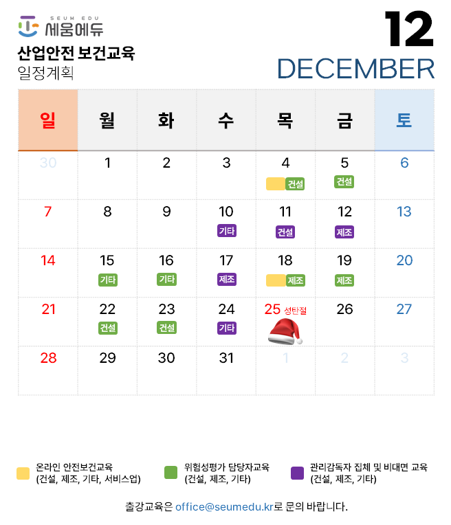 2025년 12월 진행가능한 온라인/집체/비대면 근로자, 관리감독자, 위험성평가 담당자 등 산업안전보건교육 계획을 아래와 같이 안내 합니다.