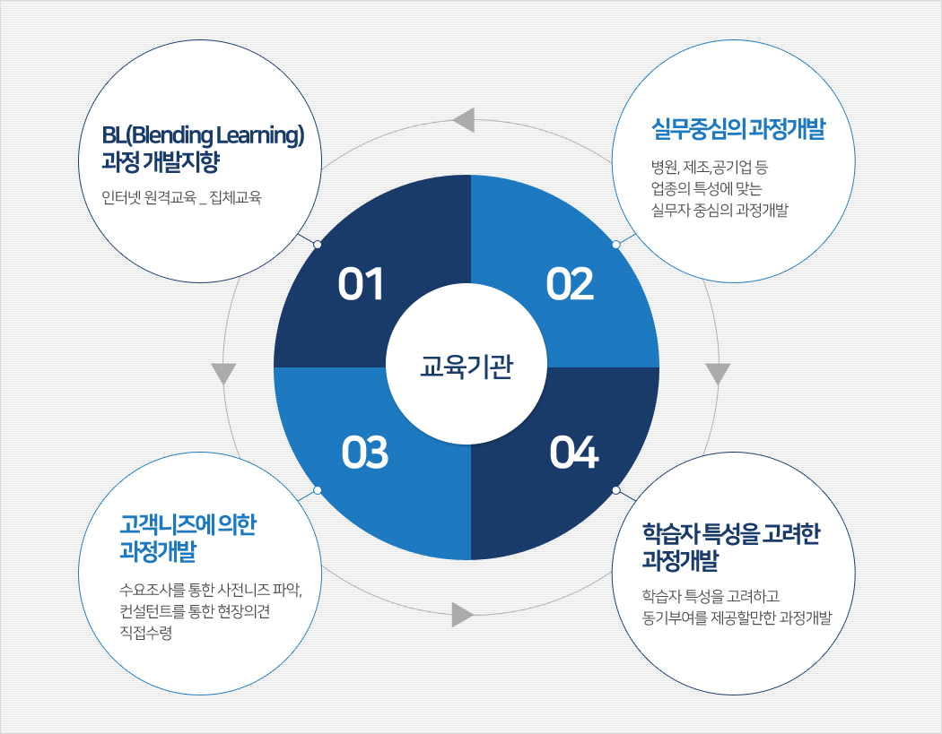 무한경쟁의 기업경영 환경에서 자기주동형 학습에 적합한 과정개발을 통하여 학습자의 역량 개발 및 미래가치 창출을 도모하고 나아가 우리 산업게에 필요한 교육과정을 개발, 보급할 수 있도록 하겠습니다.